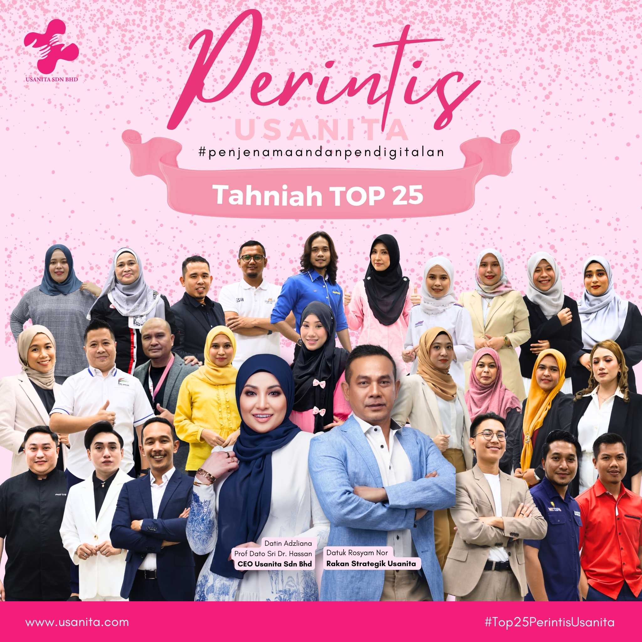 Demikian kata Ketua Pegawai Eksekutif Usanita Sdn Bhd, Datin Adzliana Prof Dato’ Sri Dr Hasan mengenai pemilihan Top 25 Perintis Usanita. Pengumuman Top 25 dilakukan secara online pada 18 Ogos lalu oleh Datin Adzliana dan Datuk Rosyam Nor.
